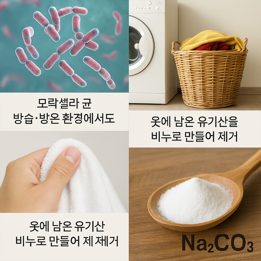 더 큰 문제는 모락셀라 균이 습도와 온도에 강하다는 점입니다. 건조기를 돌려도, 햇볕에 널어도 쉽게 죽지 않고, 오히려 세탁기 내부처럼 축축한 공간에서 잘 살아남습니다. 한 번 옷감에 번식하면 냄새가 옮겨 붙어 여러 번 세탁해도 없어지지 않으며, 다른 옷으로까지 전염되기도 합니다.