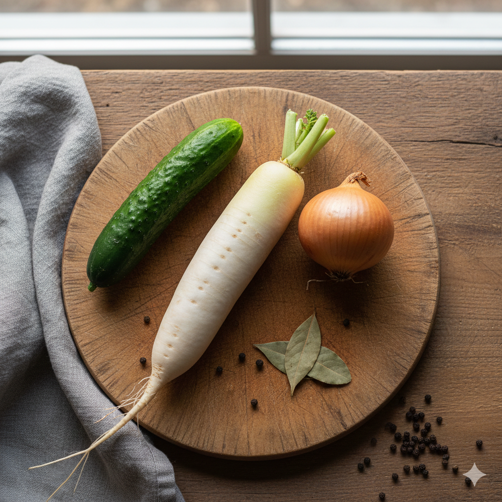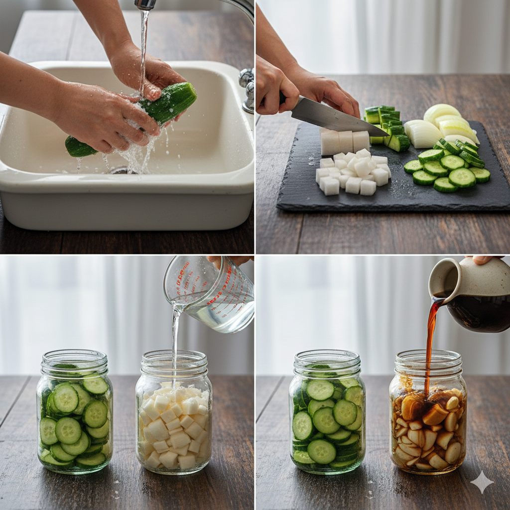 본 가이드에서는 정보의 전문성을 바탕으로, 실패 없는 '비가열 황금 비율'과 두 가지 맛(화이트 피클, 간장 장아찌)을 구현하는 비법을 상세히 공개합니다.