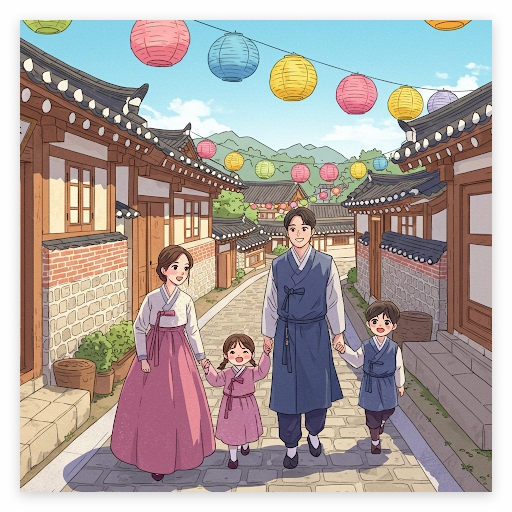 : 곱게 차려입은 한복은 한옥마을의 아름다움을 더욱 돋보이게 하는 마법 같은 존재! 온 가족이 함께 예쁜 한복을 빌려 입고 골목길을 누비며 특별한 추억을 만들어보세요. 곳곳이 포토존이니, 인생샷은 필수! 찰칵찰칵 📸