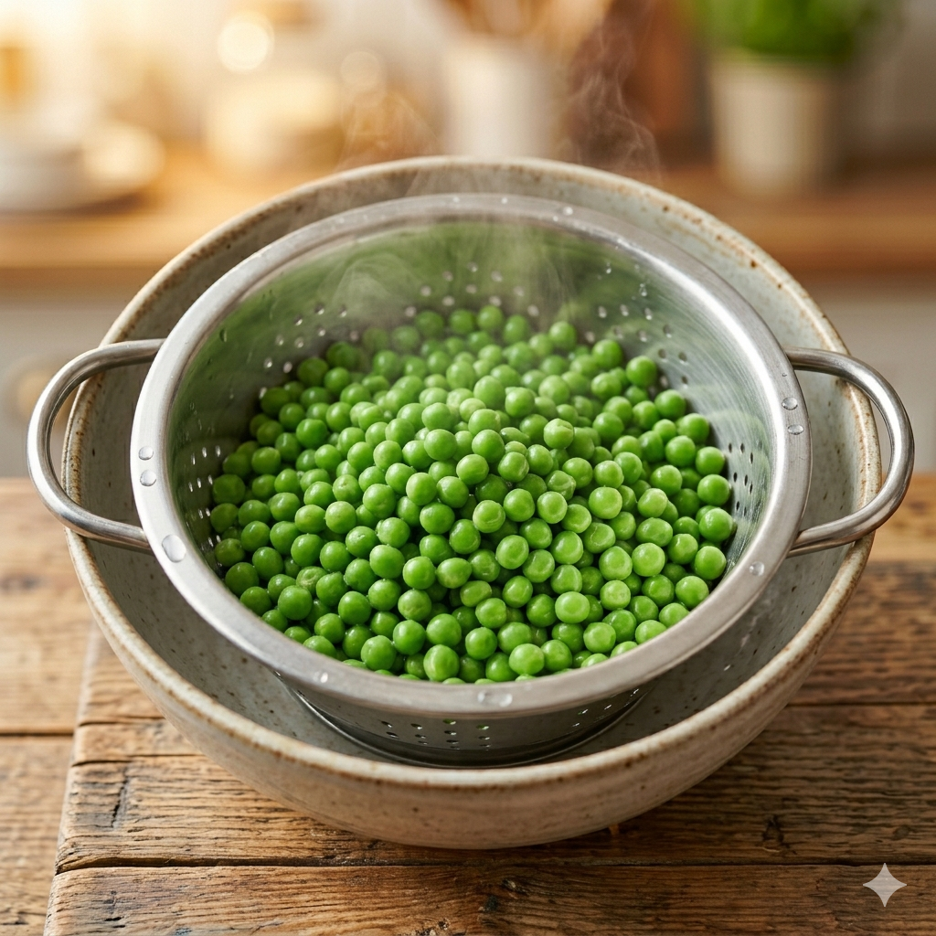 잘 삶아진 완두콩은 즉시 체에 밭쳐 물기를 뺍니다.
