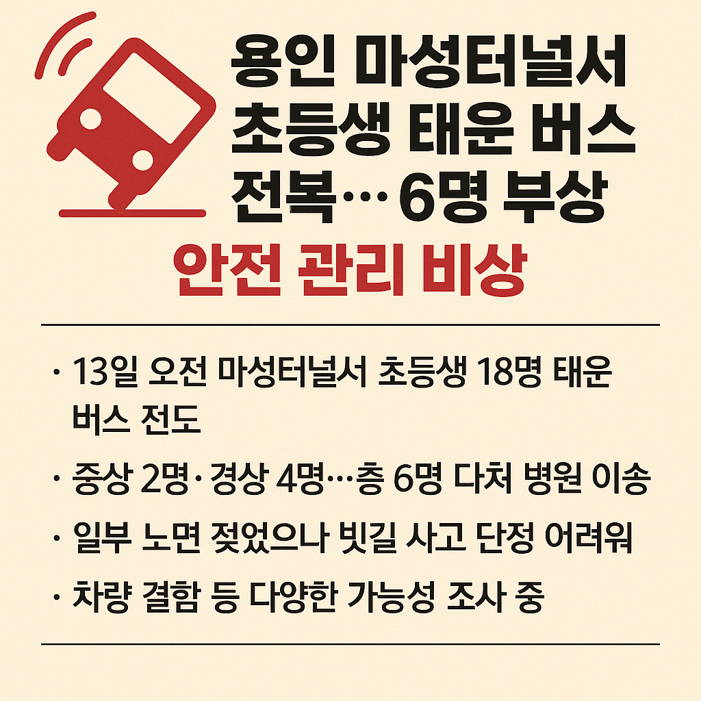 13일 오전 9시 20분경, 경기도 용인시 영동고속도로 강릉 방면 마성터널에서 초등학생 18명을 태운 소형 버스가 전도되는 사고가 발생했습니다.