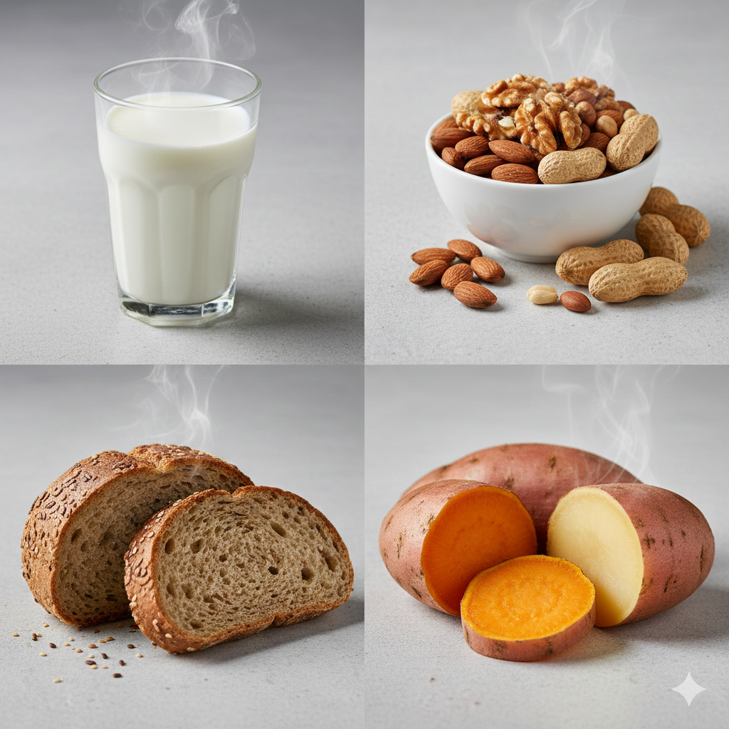 * 고구마/감자: 우유와 함께 먹으면 칼륨 흡수를 돕고 포만감을 오래 유지시켜 줍니다.