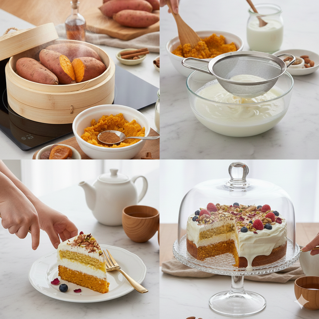 이때 고구마가 너무 퍽퍽하다면 요거트를 한 큰술 넣어 농도를 조절하세요. 이것이 케이크의 '시트' 역할을 하게 됩니다.