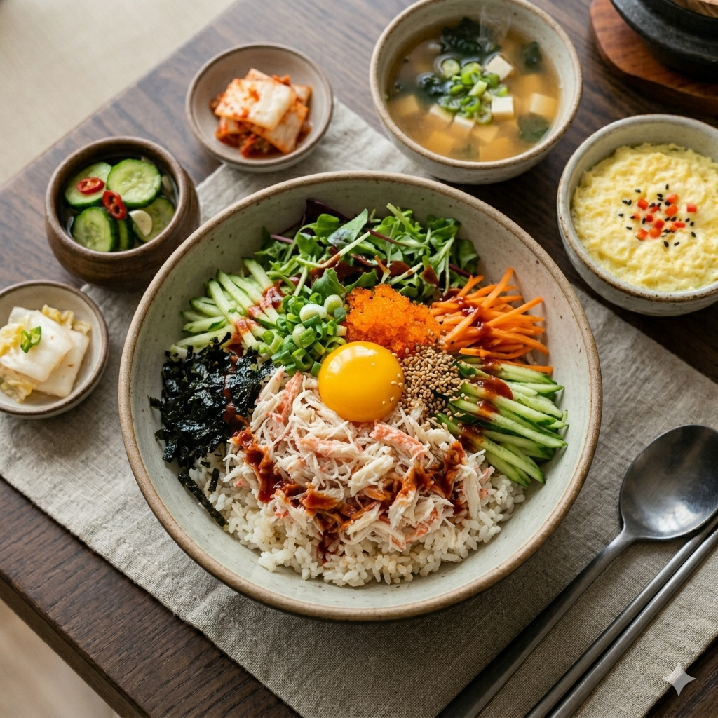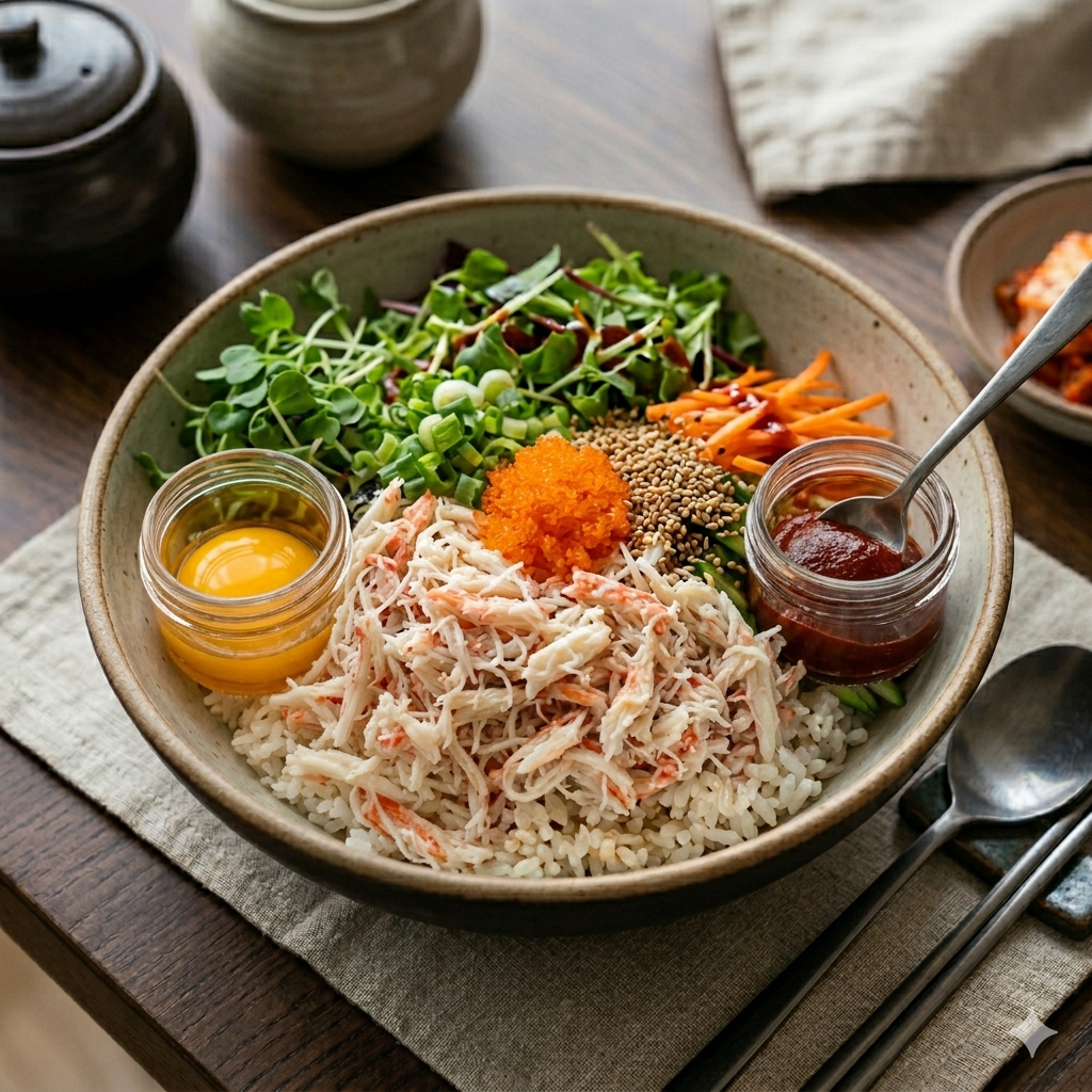 오늘 저녁, 신선한 바다 향 가득한 게살비빔밥으로 식탁을 풍성하게 꾸며보시는 건 어떨까요?