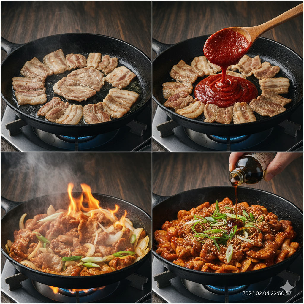 * 불맛 입히기: 가정용 가스레인지나 인덕션에서도 불맛을 내고 싶다면, 조리 마지막 단계에서 팬의 가장자리에 간장 1큰술을 눌리듯 부어준 뒤 고기와 섞어주세요. 이 '간장 누름' 효과가 훈연 향을 더해줍니다.