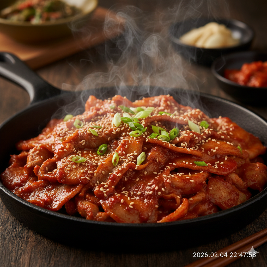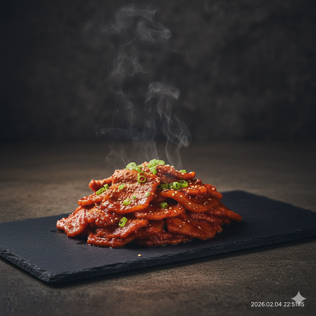 얇은 고기 사이사이로 진한 양념이 빠르게 스며들어 짧은 조리 시간에도 깊은 풍미를 느낄 수 있는 것이 이 요리의 가장 큰 장점입니다.
