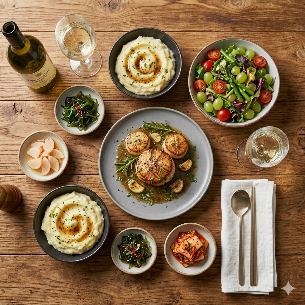 * 매쉬드 포테이토: 부드러운 감자 페이스트 위에 관자를 올리면 질감이 더욱 풍부해집니다.