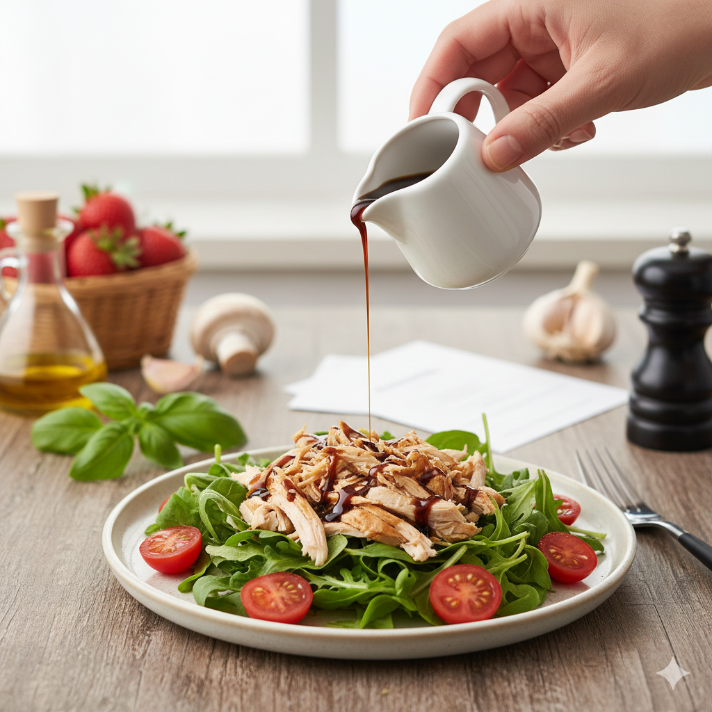(선택 사항) 마지막으로 발사믹 글레이즈를 접시 가장자리에 가볍게 둘러 시각적인 효과와 함께 새콤달콤한 맛을 더합니다.