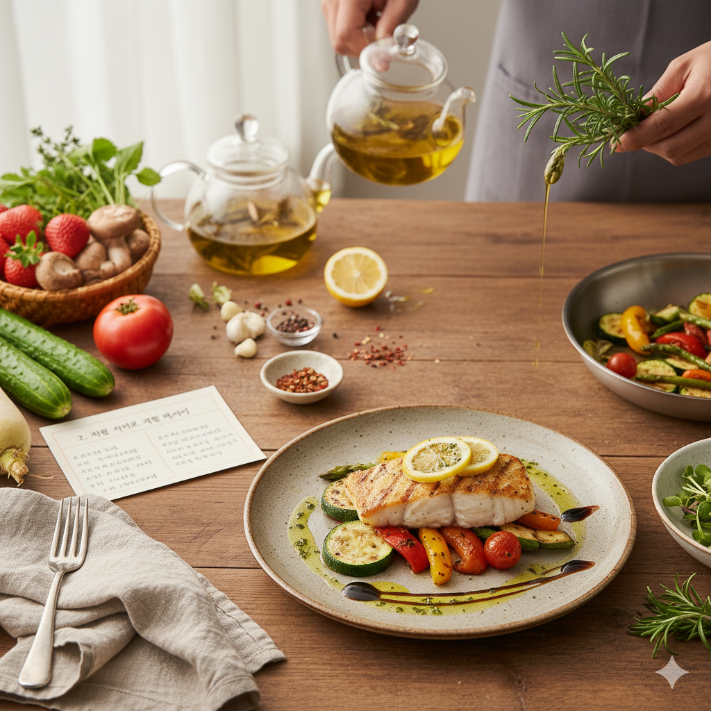4. [메인 레시피] 제철 해산물과 채소의 조화: 지중해식 저염 대구 스테이크 (feat. 허브 올리브 오일 드레싱)