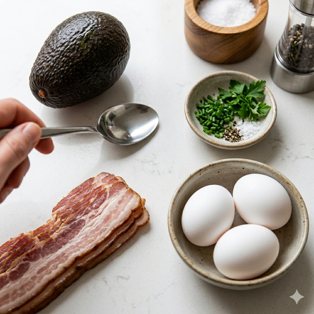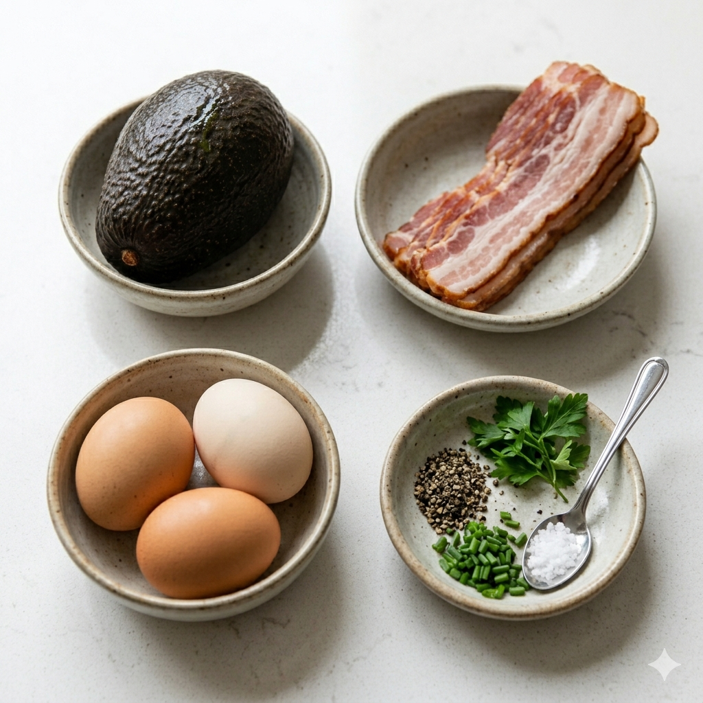 * 메인 재료: 잘 익은 아보카도 1개, 신선한 달걀 2알, 롱 베이컨 2줄