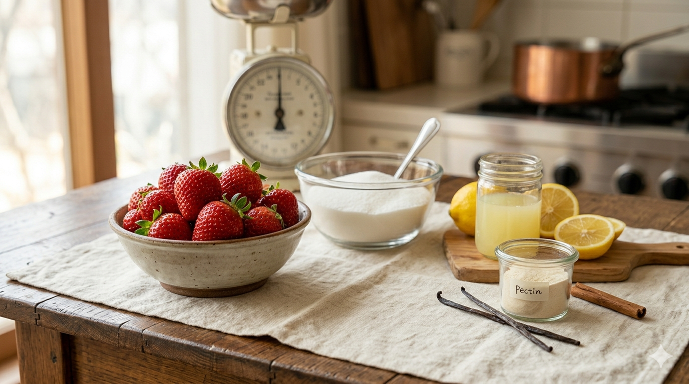 * 흰 설탕 (750g ~ 1kg): 딸기 무게의 최소 50% 이상을 권장합니다. 당도가 너무 낮으면 잼이 젤화되지 않고 쉽게 부패합니다. (장기 보관용은 1:1 비율 권장)