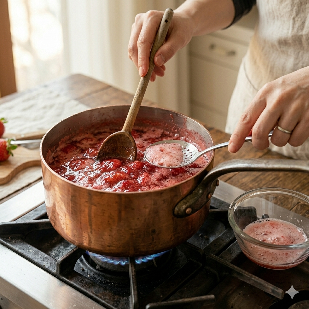 귀찮더라도 꼼꼼히 걷어내야 잼의 투명도가 살아나고 뒷맛이 깔끔해집니다.