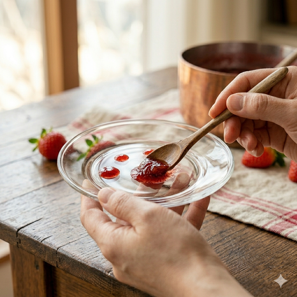 ✔️ 전문가 팁 (찬물 테스트): 찬물에 잼 한 방울을 떨어뜨렸을 때, 퍼지지 않고 구슬 모양으로 가라앉으면 완성입니다. 식으면 지금보다 1.5배는 더 단단해진다는 사실을 잊지 마세요!
