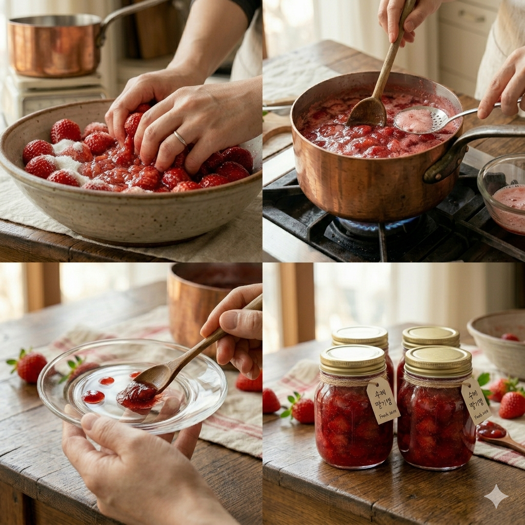 수제 딸기잼은 단순히 음식을 만드는 행위를 넘어, 제철의 싱그러움을 병 속에 박제하여 사계절 내내 꺼내 먹는 즐거움을 줍니다.