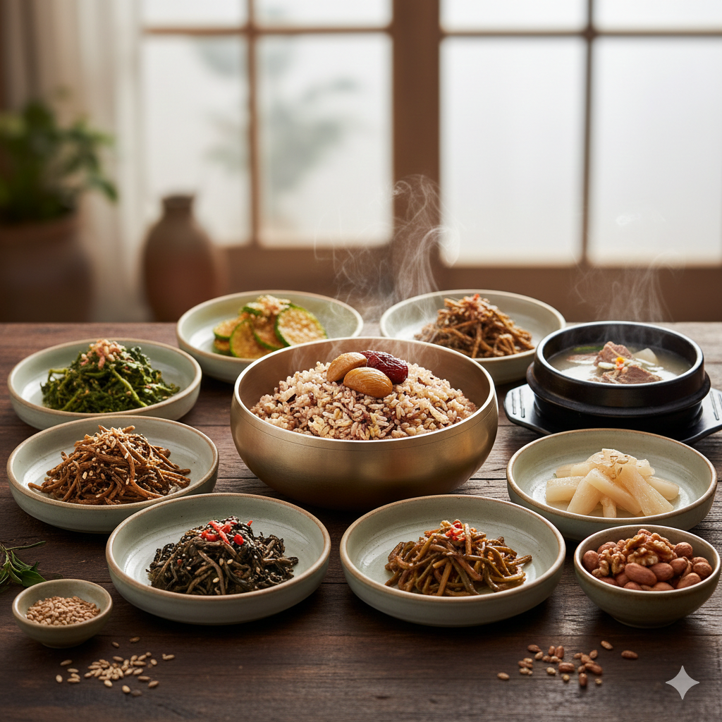 * 9가지 진채(보름 나물): 시래기, 고사리, 취나물, 호박고지 등 말린 나물을 들기름에 볶아 곁들이면 부족한 비타민을 완벽히 보충합니다.