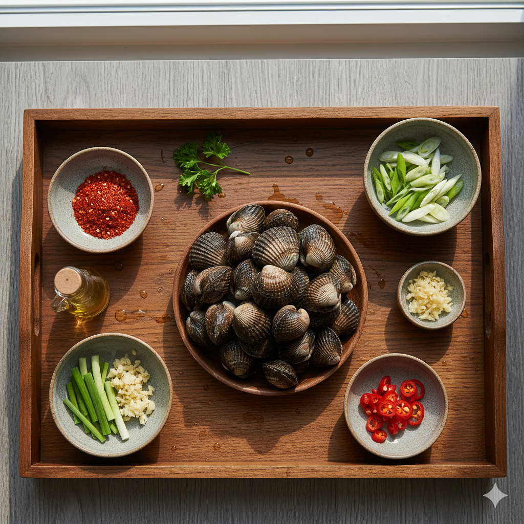 1. 메인 재료: 새꼬막 1kg, 굵은 소금 2큰술 (해감용), 청주 1큰술 (데치기용)