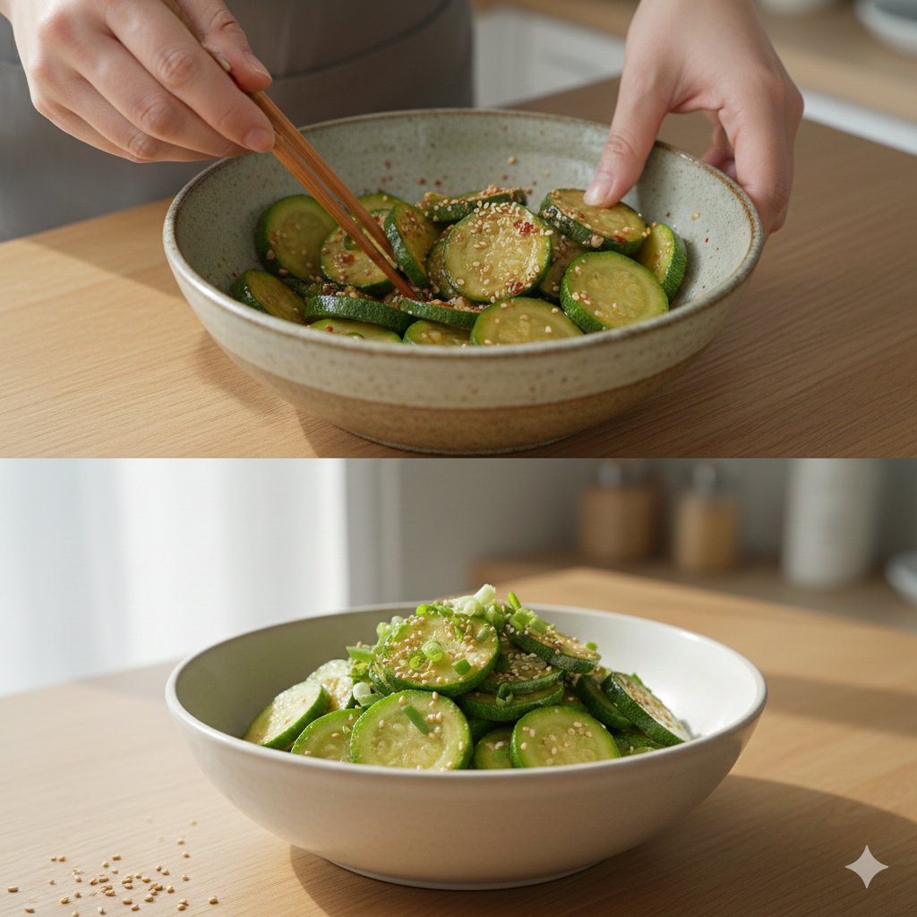 바로 먹어도 맛있지만, 양념에 버무린 애호박 찜 무침을 냉장고에 30분 정도 숙성시키면 양념이 호박에 깊게 배어들어 더욱 깊고 풍부한 맛을 즐길 수 있습니다.