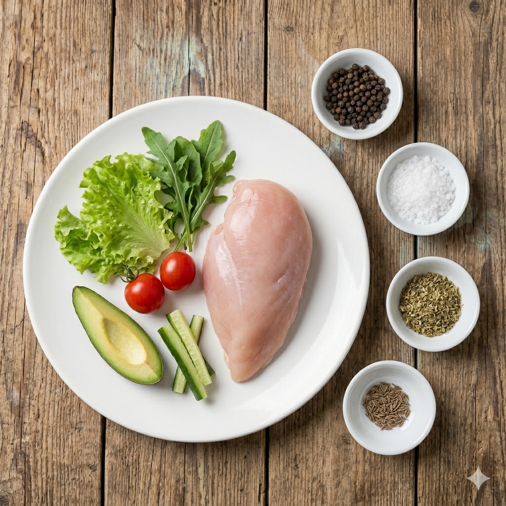 * 재료: 닭가슴살 1쪽, 샐러드 채소 (양상추, 로메인, 케일 등), 방울토마토, 오이, 파프리카, 양파, 오리엔탈 드레싱 (또는 발사믹 드레싱)