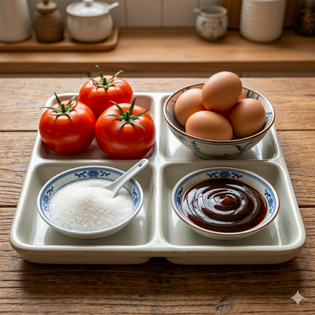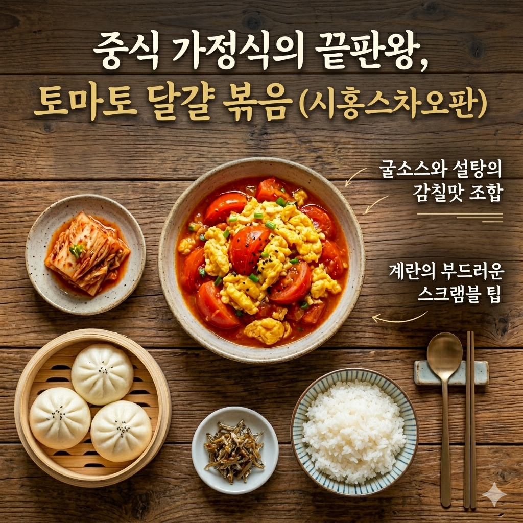 붉은 토마토와 노란 달걀의 화려한 색감 대비는 입맛을 돋우기에 충분하며, 굴소스와 설탕만으로 완성되는 감칠맛은 그 어떤 고급 요리 못지않습니다.