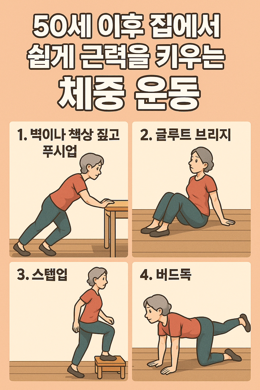 이 네 가지 운동을 하루 15~20분씩 꾸준히 실천하면, 근육량 유지뿐 아니라 활력과 자신감도 함께 되찾을 수 있다.