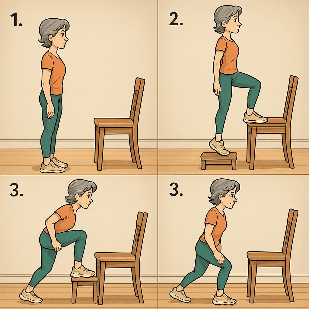 스텝업은 계단 오르기와 동일한 움직임으로 하체 근력 + 균형 감각을 동시에 길러준다.