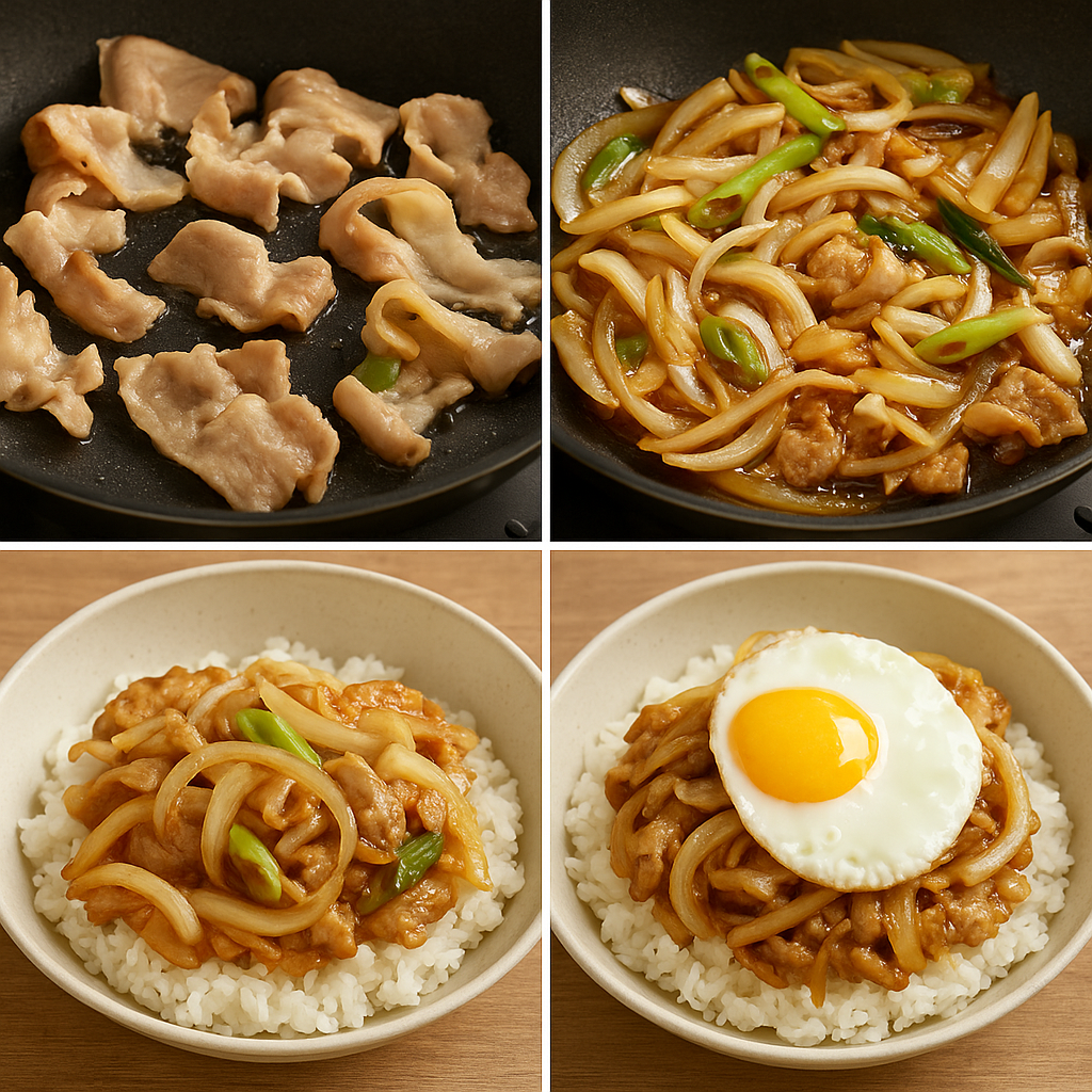 4️⃣ 덮밥 완성: 밥 위에 삼겹살을 올리고 반숙 계란 프라이를 얹으면 끝!