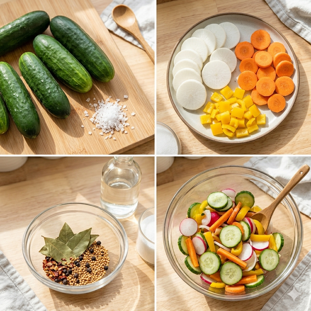 💡 전문 요리 Tip: 채소를 썬 후 물기를 완전히 제거해야 피클이 금방 무르지 않고 오랫동안 아삭함이 유지됩니다.