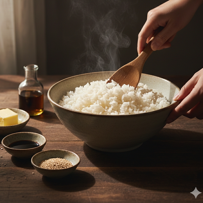 : 밥에 버터를 넣으면 고소한 풍미가 극대화되고, 밥알 하나하나에 윤기가 흘러 부드러운 식감을 더합니다.
