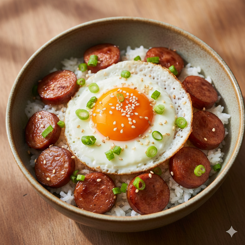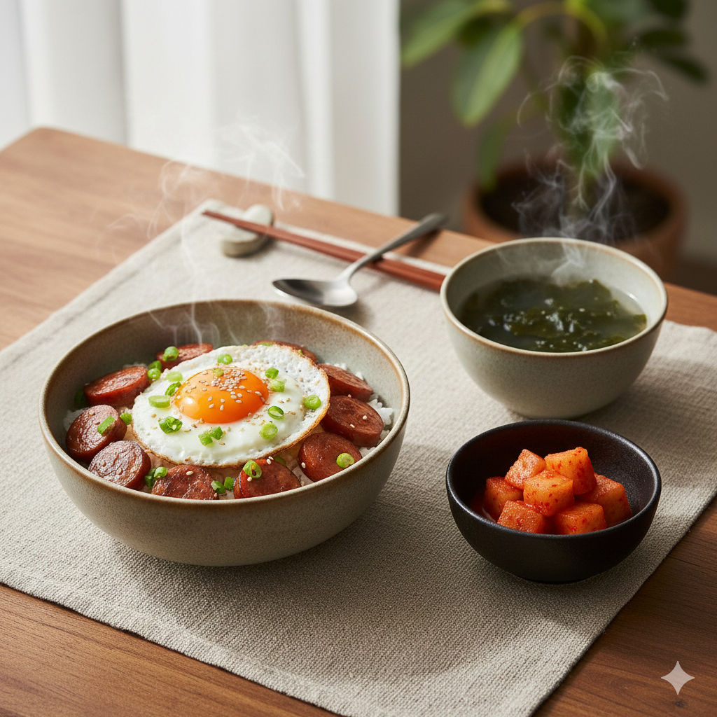 랩을 살짝 씌우거나 전자레인지용 덮개를 덮은 후, 700W 기준 3분 30초, 1000W 기준 2분 30초~3분 정도 돌려줍니다. 계란이 몽글몽글하게 익고 소시지에서 기름이 배어 나와 밥에 스며들면 성공입니다.