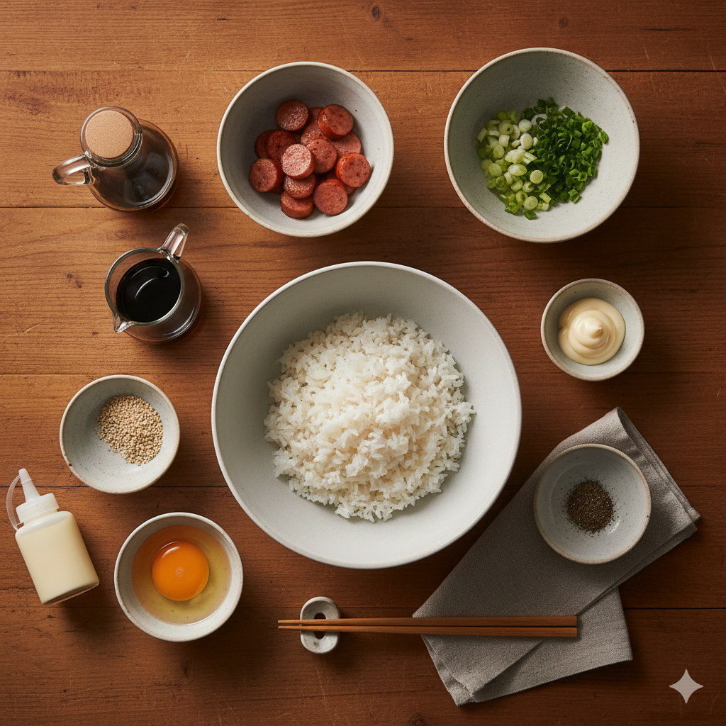 * 메인 재료: 공깃밥 1공기 (약 200~300g), 프랑크 소시지 2개, 계란 1알, 대파 약간
