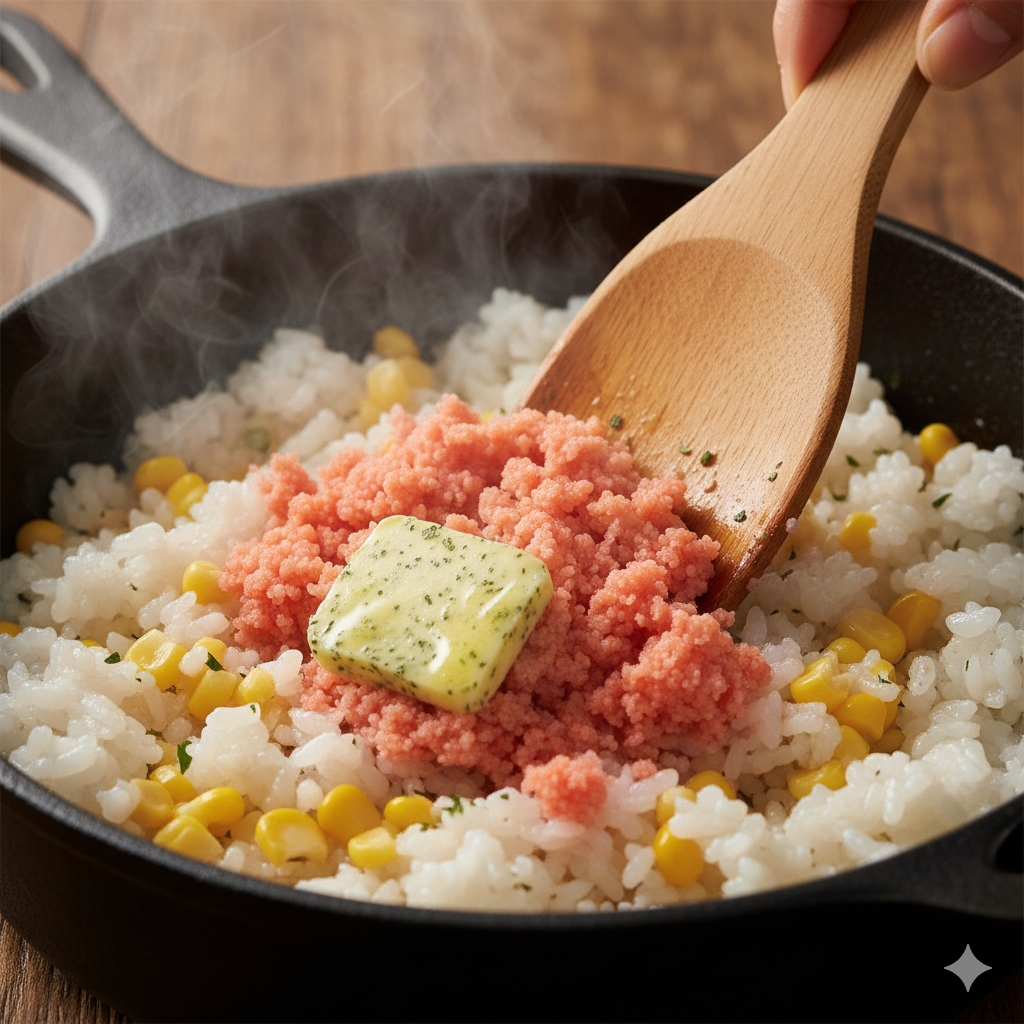 : 주걱을 세워 명란을 톡톡 터뜨리듯 으깨고, 다시마버터가 모든 알갱이에 코팅되도록 부드럽게 섞어줍니다.