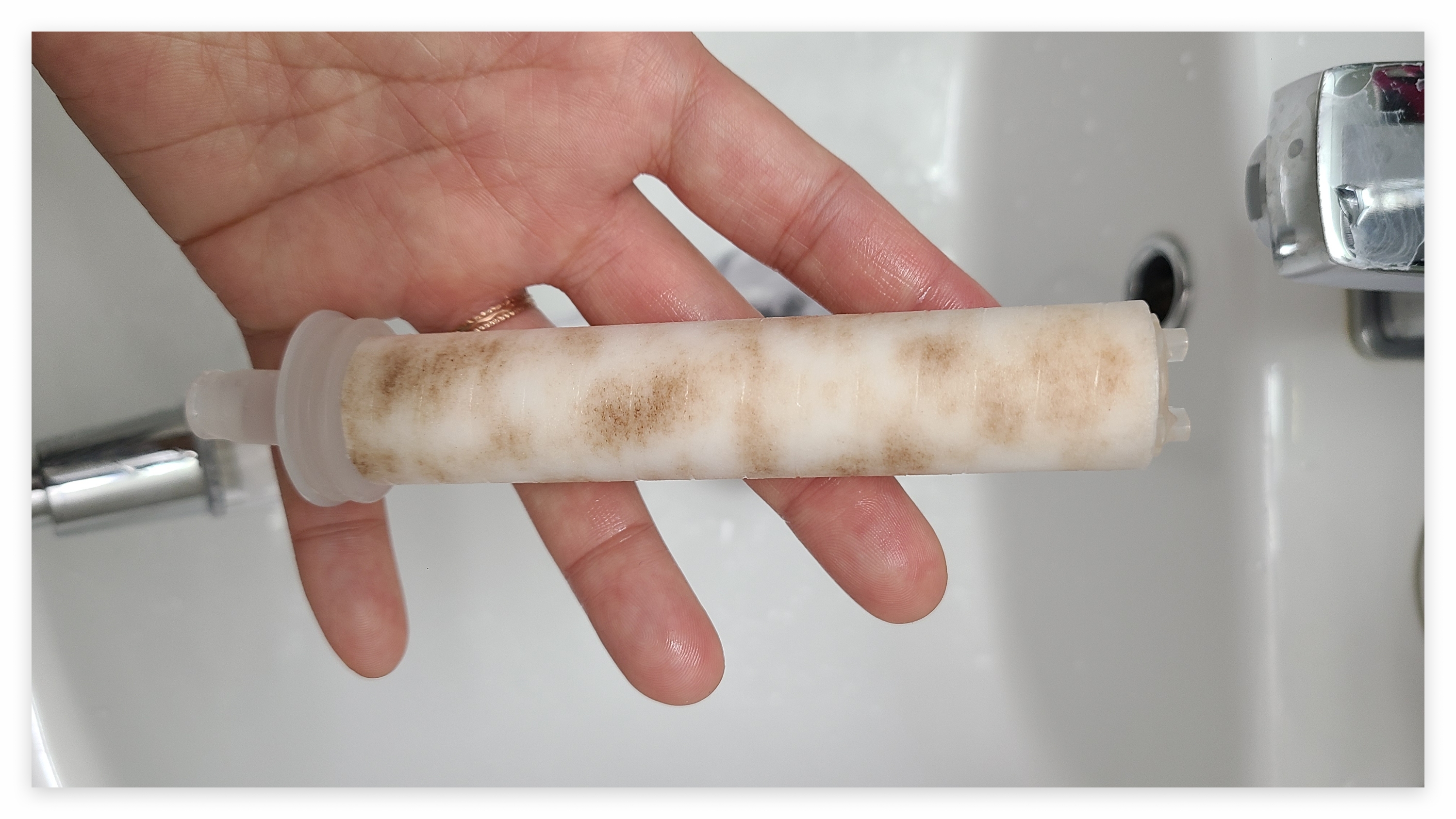 : 오래된 배관에서 나온 녹물과 불순물로 인해 필터가 심하게 오염된 모습입니다.