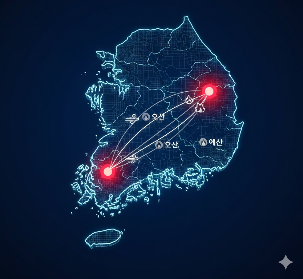 이번 산불의 가장 큰 특징은 약 1시간의 시차를 두고 서산과 예산 두 지역에서 동시다발적으로 발생했다는 점입니다.