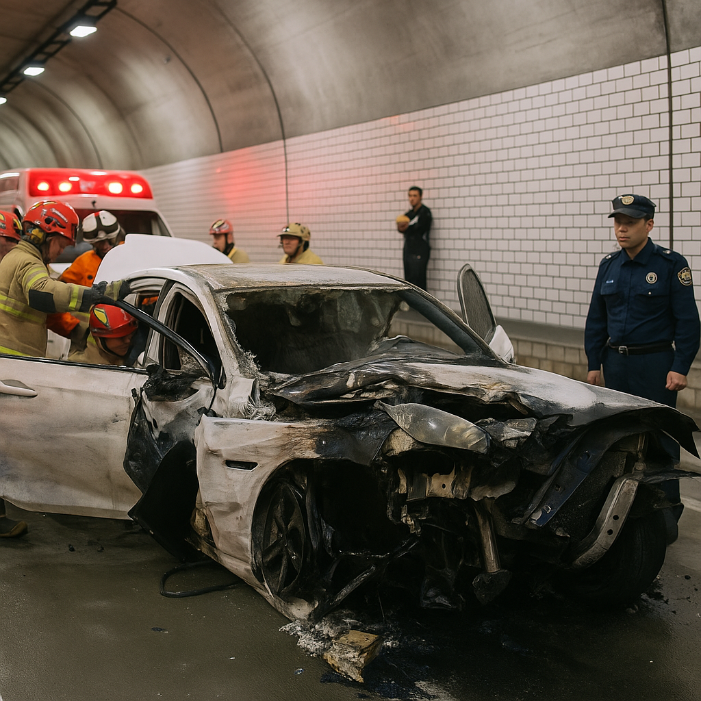 1대의 승용차가 터널 벽을 들이받고 전복되었고, 그 직후 차량은 화염에 휩싸였습니다.