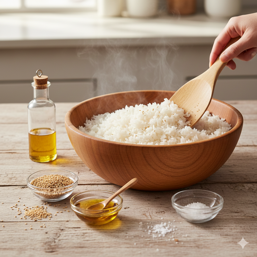 : 갓 지은 따뜻한 밥에 참기름 2큰술, 소금 1/2 작은술을 넣고 주걱으로 살살 버무려줍니다. 밥알이 으깨지지 않도록 주의하며 고루 섞어줍니다.