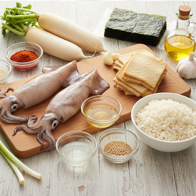 끓는 물에 소주(또는 청주) 1큰술을 넣고 손질한 오징어를 넣어 약 1분 정도 살짝 데쳐냅니다. 너무 오래 데치면 질겨지니 주의하세요.