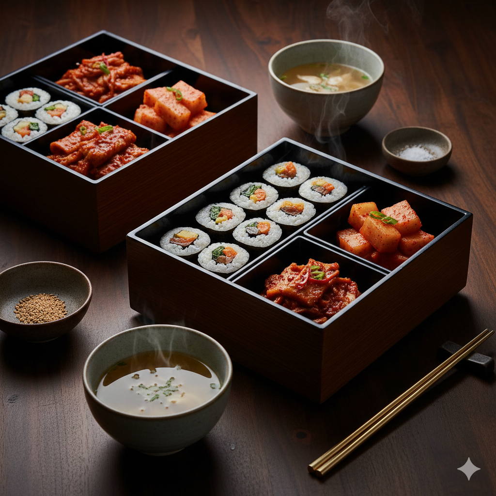 이러한 독특한 구성은 밥과 반찬이 분리되어 있어 쉽게 상하지 않으면서도, 각 재료의 신선한 맛을 온전히 즐길 수 있게 해줍니다.