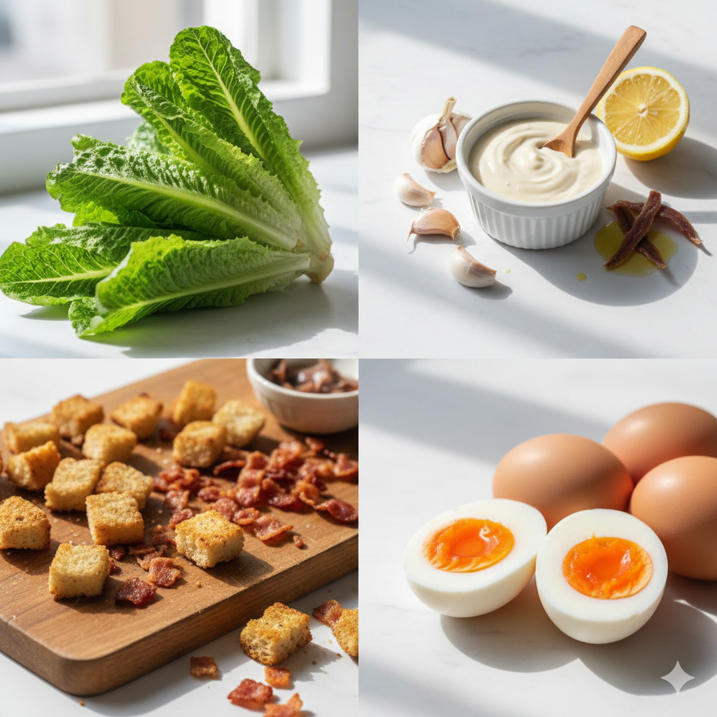* 온도감: 로메인은 차갑게, 크루통과 베이컨은 온기가 살짝 남아있을 때 서빙하면 입안에서 느껴지는 온도 차이가 식감을 극대화합니다.