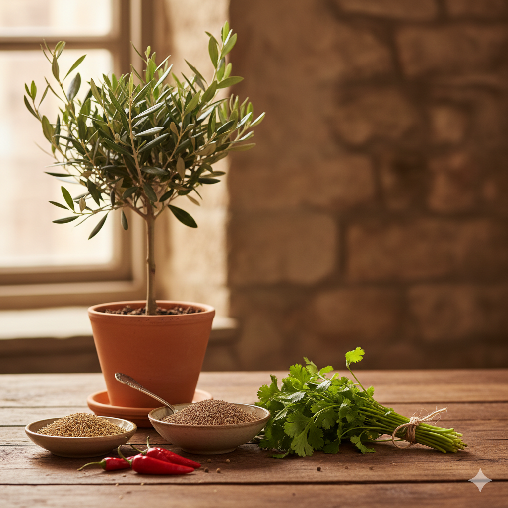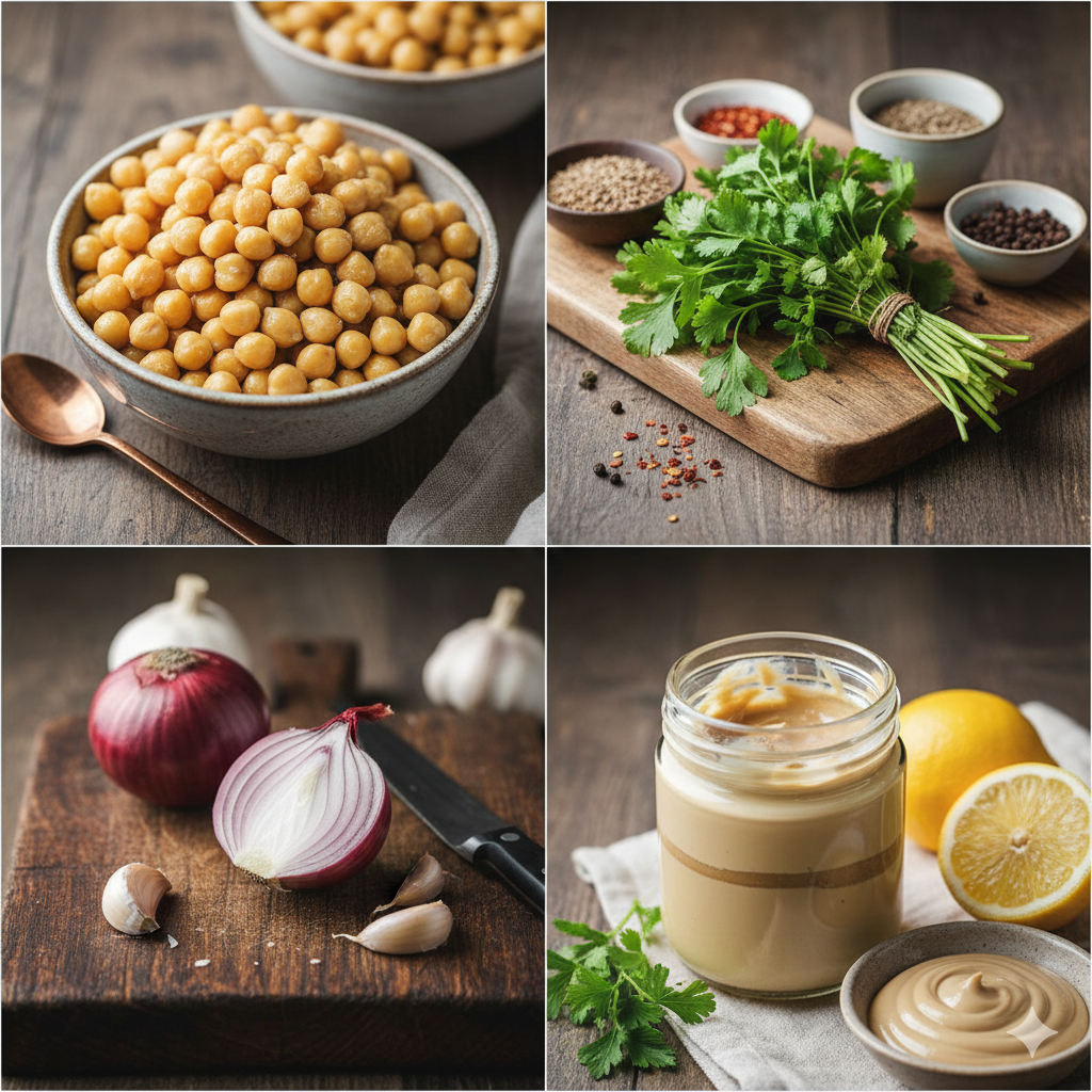 * 향신료 및 채소: 신선한 고수(또는 파슬리) 2컵, 다진 마늘 4쪽, 양파 1/2개, 큐민 가루 2큰술, 고춧가루 1/2작은술, 소금/후추 약간