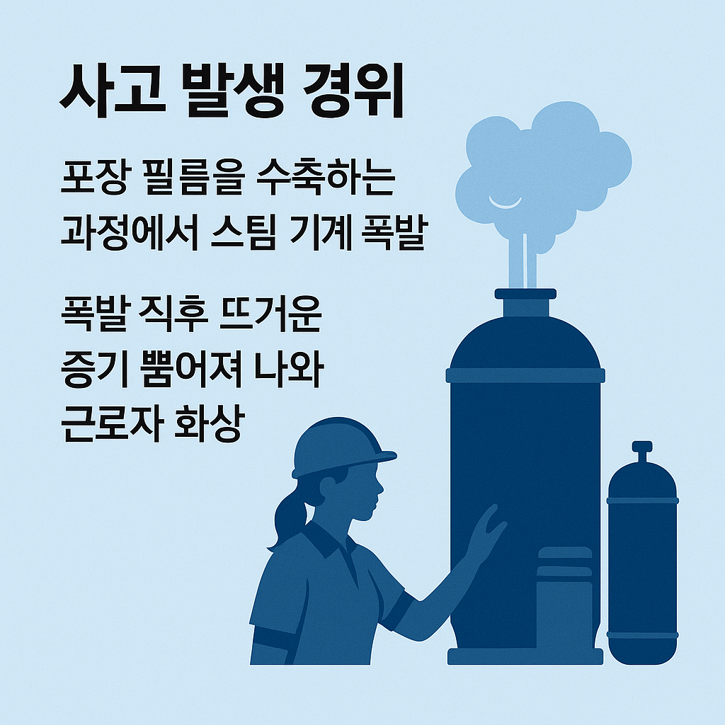 해당 공정에 사용되던 스팀 기계가 갑자기 폭발하면서 고온의 증기와 파편이 주변 근로자들에게 직접적으로 영향을 끼쳤습니다.