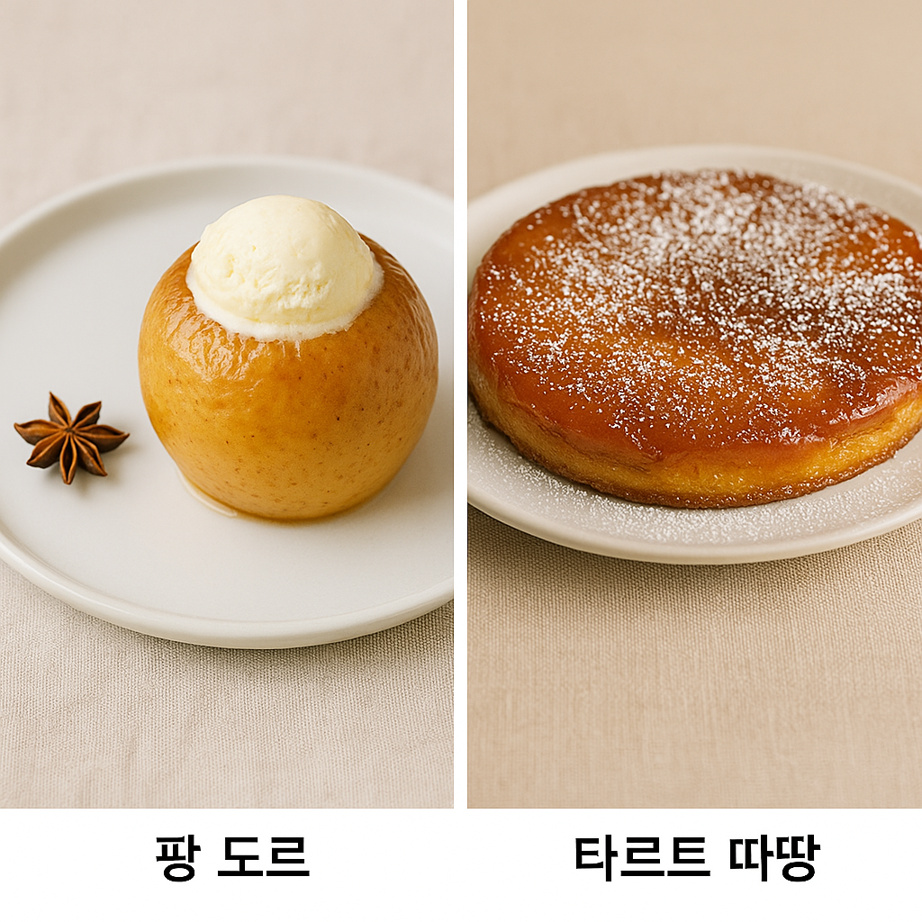 불어로 Pommes au four라 불리는 팡 도르는 사과를 오븐에 통째로 구워내는 심플한 레시피이며, Tarte Tatin은 캐러멜 사과를 활용한 역전 타르트로 프랑스 전통 디저트의 진수를 보여줍니다.