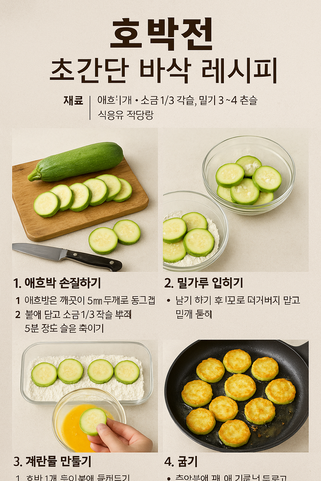 특히 애호박의 수분 조절이 호박전 맛의 핵심이므로 재료 준비 단계부터 호박의 수분을 적절하게 잡아주는 과정이 필요합니다.