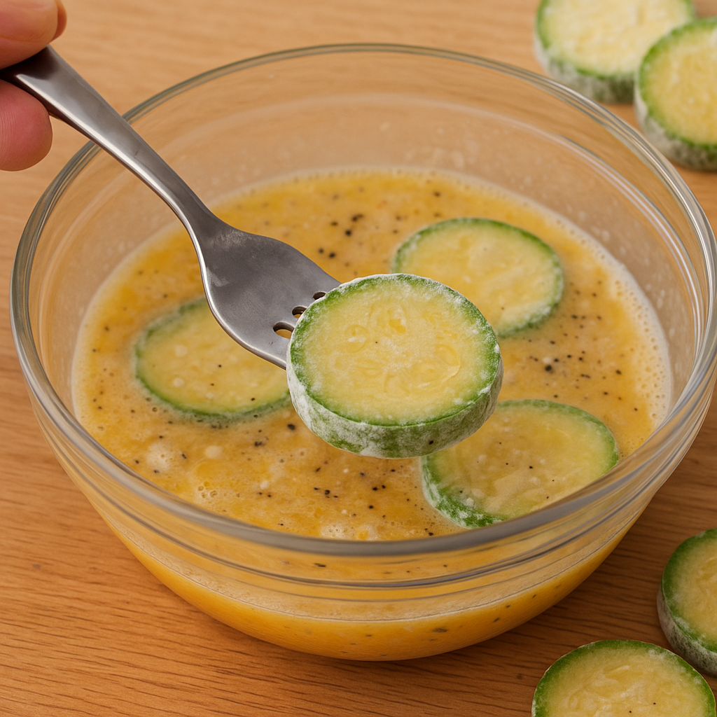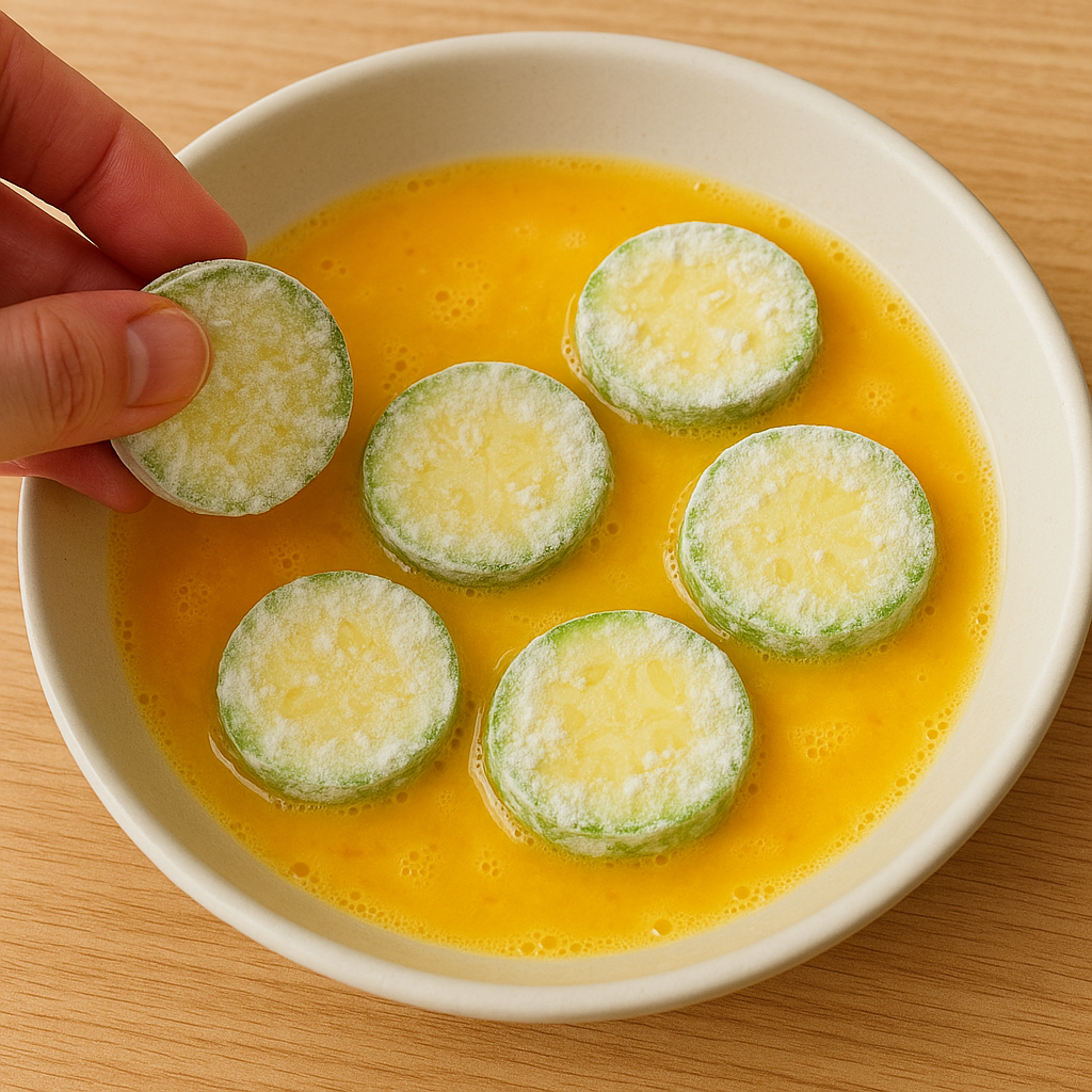 2. 밀가루 코팅한 애호박을 계란물에 담가 골고루 묻힙니다.