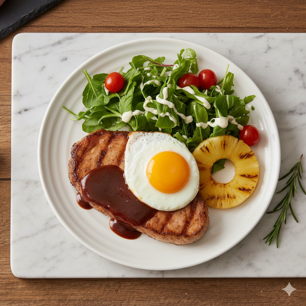 가니쉬(곁들임): 믹스 샐러드 50g, 방울토마토 2개, 캔 파인애플 1슬라이스, 달걀 1개