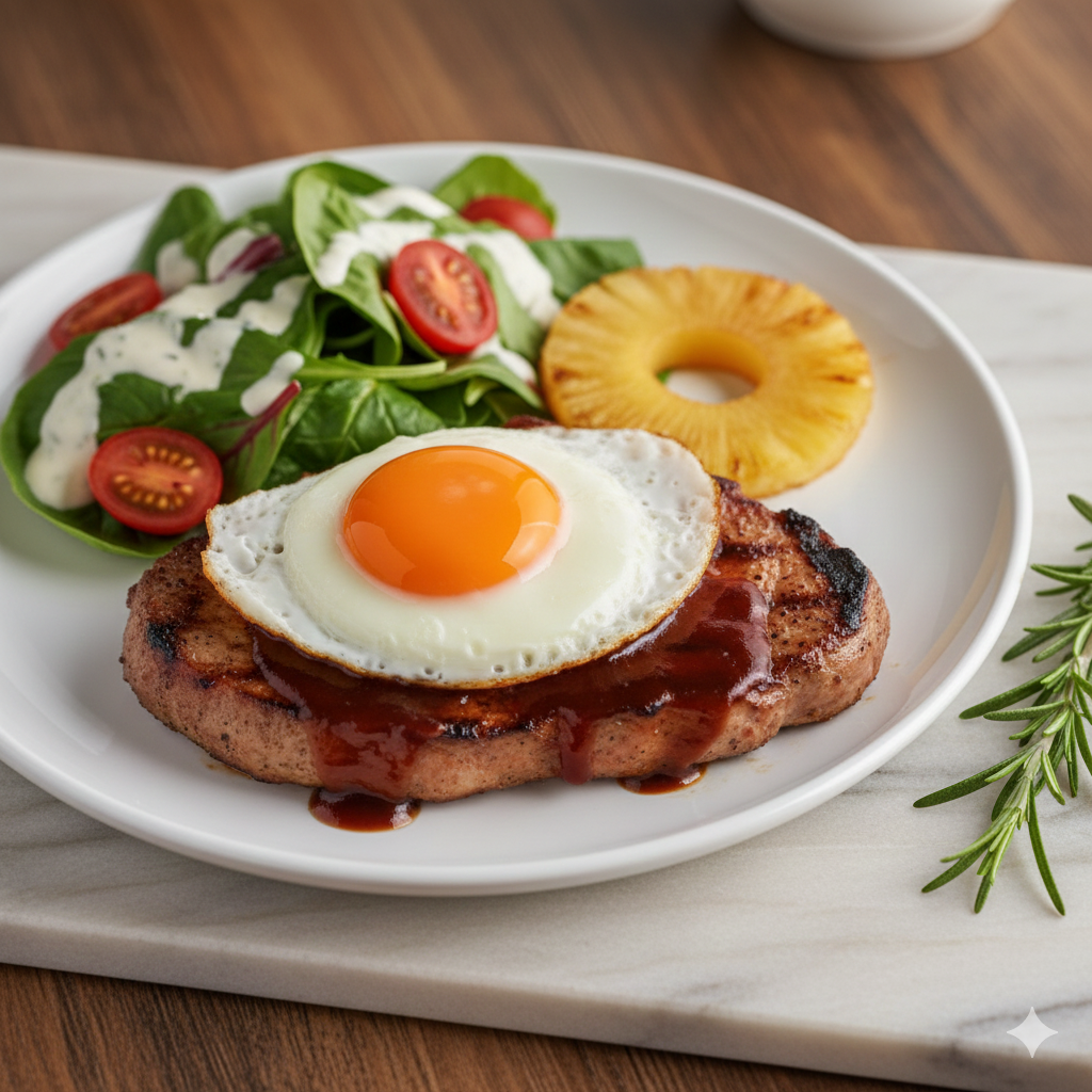 가니쉬(곁들임): 믹스 샐러드 50g, 방울토마토 2개, 캔 파인애플 1슬라이스, 달걀 1개