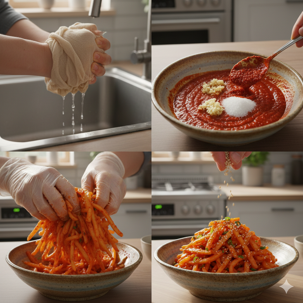 * 수분 차단: 무친 후 시간이 지나면 채수가 나올 수 있습니다. 바로 드실 양만큼만 무치거나, 전처리 단계에서 물기를 확실히 제거하는 것이 가장 중요합니다.