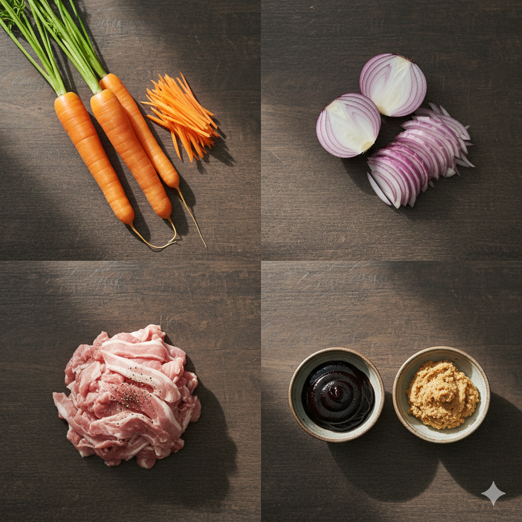 돼지고기와 자색 양파를 당근 면의 굵기에 맞춰 얇게 채 썹니다.