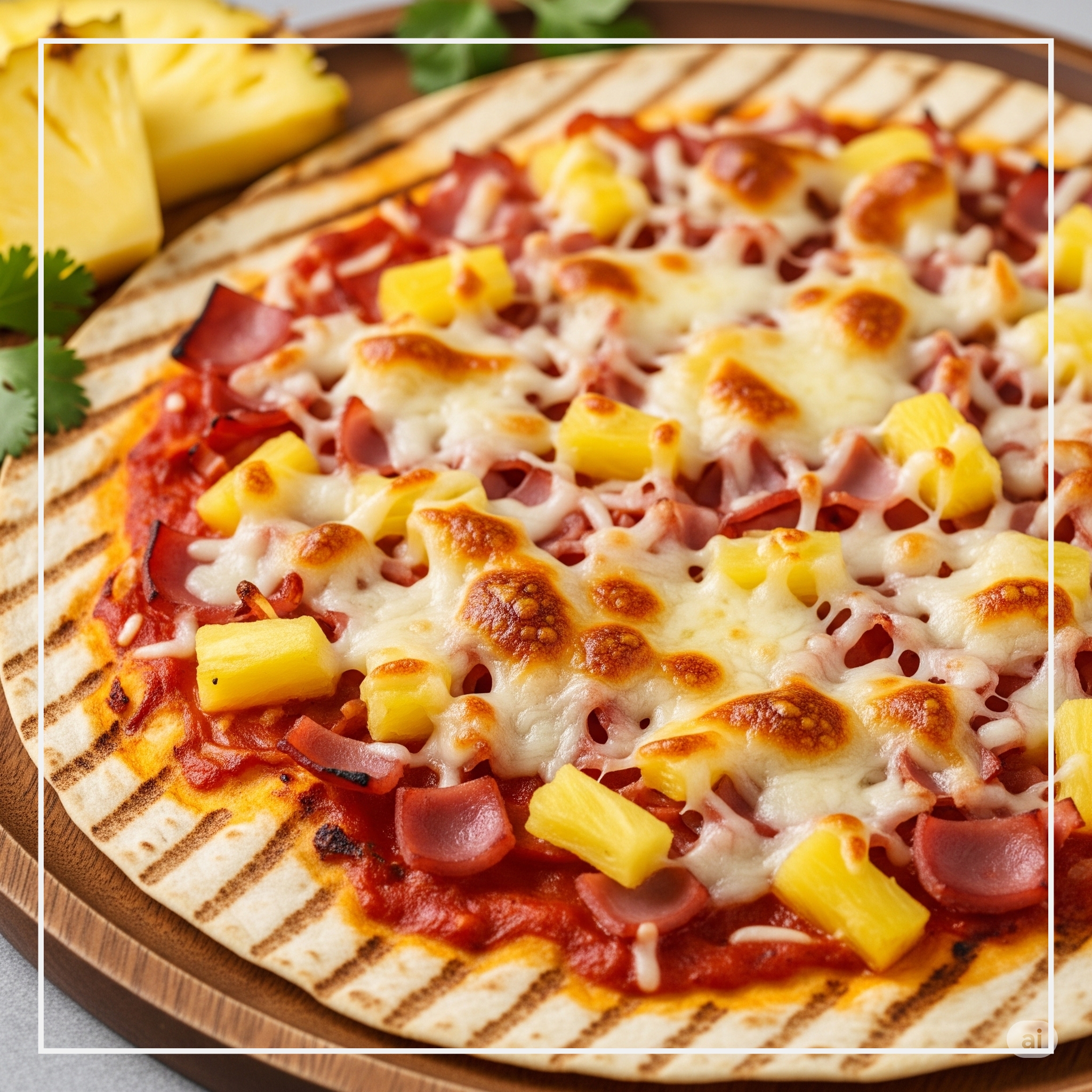 - 구워진 피자 위에 파슬리 가루 등을 뿌려 마무리하면 맛있는 또띠아 하와이안 피자 완성!