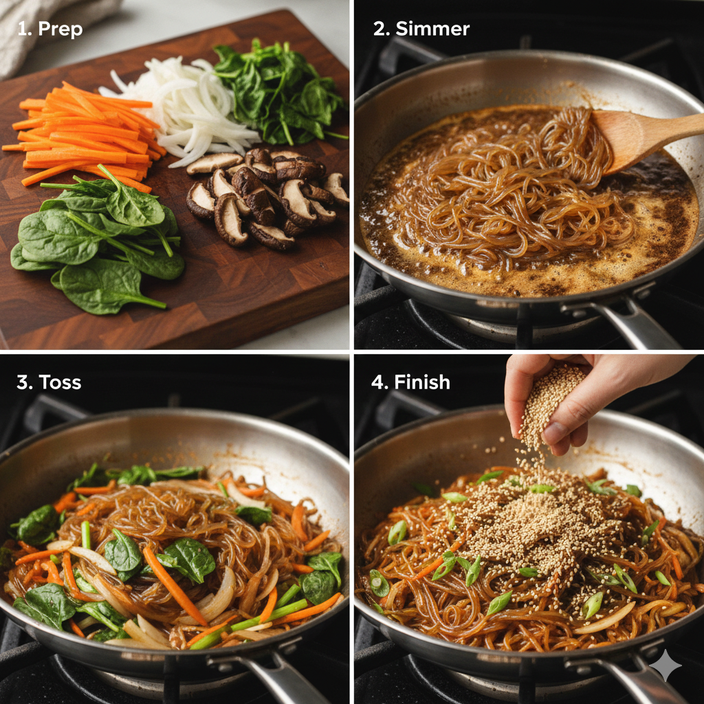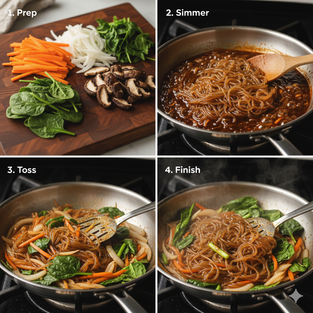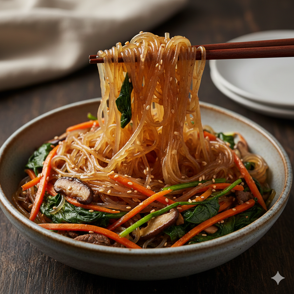 잡채의 핵심은 당면의 식감과 간장 베이스의 조화로운 양념입니다.