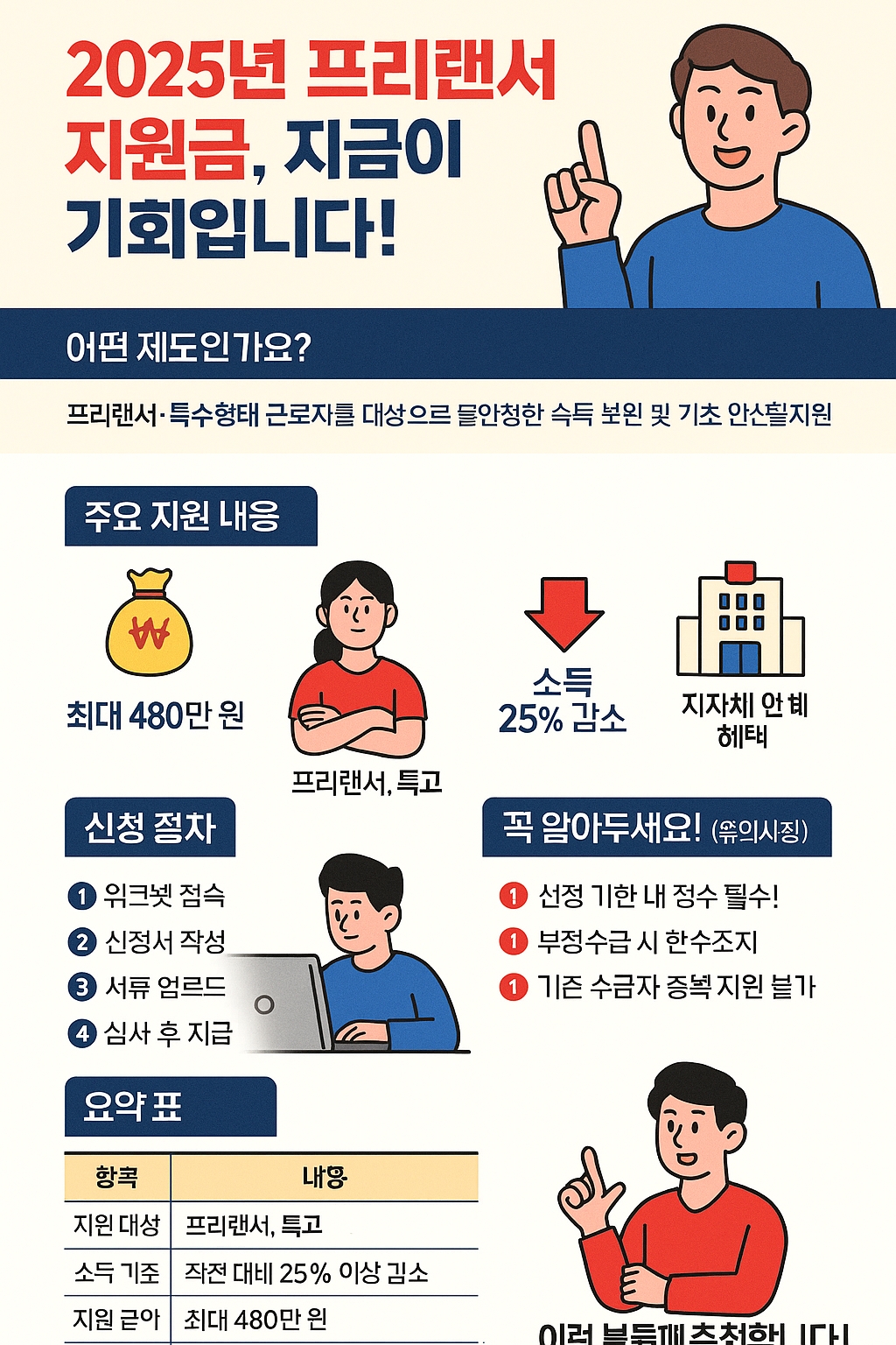 이 제도는 단순한 지원금을 넘어, "프리랜서도 사회안전망 안에서 보호받을 수 있다"는 첫걸음입니다.